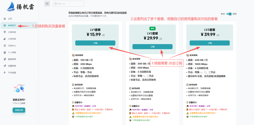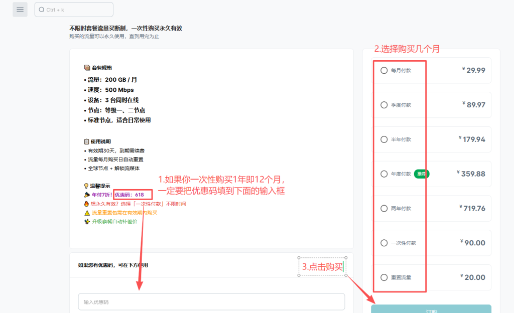 3.切换到 套餐购买界面。选择自己合适的套餐进行购买